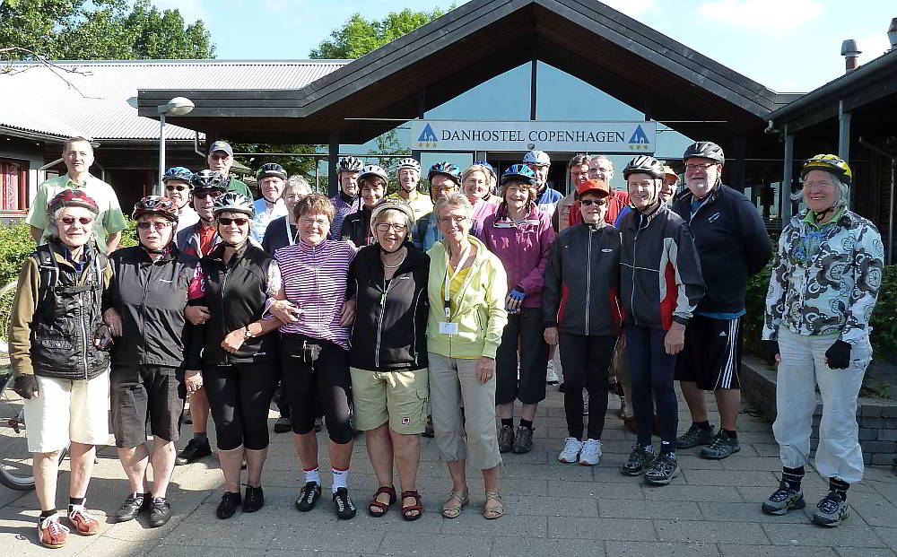 8 Teilnehmer waren mit dem Flugzeug angereist, die Mehrheit aber mit dem Privat-Pkw mit Zwischenstopps wie z. B. in der Lüneburger Heide und auf Fehmarn. Die meisten Autofahrer hatten ihr eigenes Fahrrad mitgebracht. Man konnte aber auch Fahrräder in der Danhostel mieten, bei rechtzeitiger Anmeldung hatten uns unsere dänischen Freunde ihre Zweiträder zur Verfügung gestellt. Ein Großteil der Teilnehmer kannte sich schon von anderen Veranstaltungen, hauptsächlich von Oscar. Außer den Organisatoren Inge-Lise & Knud Eiler, Kirsten & Henning, Marie & Gustav, Ulla & Steen sowie Gitte, begrüßten uns auch Bente & Bruno, die wir durch unsere Partnerschaft mit Kopenhagen schon seit 1999 kennen.