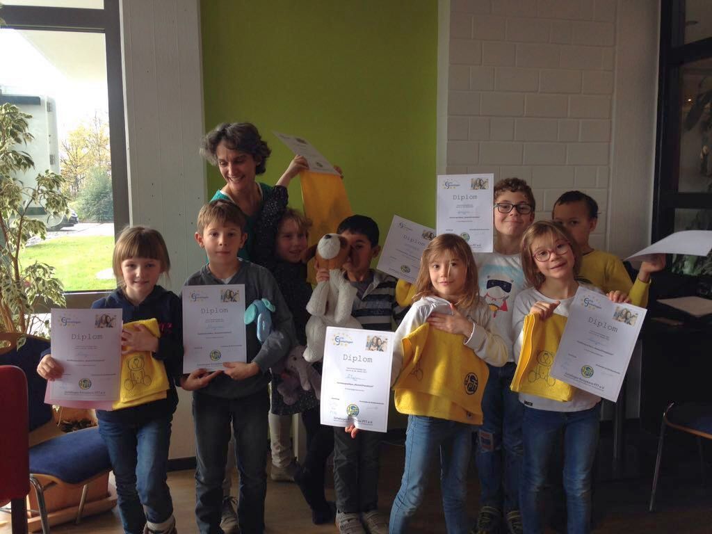 Am Montag begann um 10.00 Uhr der Sprachkurs mit einer Vorstellungsrunde mit Hilfe von 2 Elefanten, die jeden Tag die Kinder und Erwachsenen gemeinsam mit der Dozentin Lara Vincent in beiden Sprachen begrüßten. Jeder Teilnehmer stellte sich in der jeweils für ihn neuen Sprache vor. Dabei wurde gesungen und in Form von Liedern, Gedichten, gespielten Geschichten und immer wiederkehrenden Texten in beiden Sprachen vergingen die täglich 2 Stunden wie im Flug. In der 1. Stunde stand Französisch und in der 2. Stunde Deutsch im Mittelpunkt. Dabei halfen die Franzosen den Deutschen und umgekehrt die Deutschen den Franzosen. Lara verstand es wunderbar die Ereignisse des Vortages in den Kurs einzubeziehen. pruem unterricht1 250Die Kinder malten und bastelten und stellten dann ihre Bilder in beiden Sprachen vor.