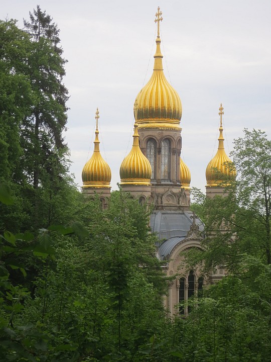 Oben angekommen geht der Weg für uns auf der anderen Seite leider wieder bergab Aber wir wollen die Russisch-Orthodoxe Kirche „Kirche der heiligen Elisabeth in Wiesbaden“ besichtigen. Eine prächtige kleine Kirche mit fünf vergoldeten Zwiebelkuppeln, die im russisch-byzantinischen Stil für die sterblichen Überreste der aus St. Petersburg stammenden Gattin Herzog Adolfs, Großfürstin Elisabeth Michailovna und ihrem Kind, geschaffen wurde. Die Großfürstin war im Alter von 18 Jahren bei der Geburt ihres Kindes gestorben.