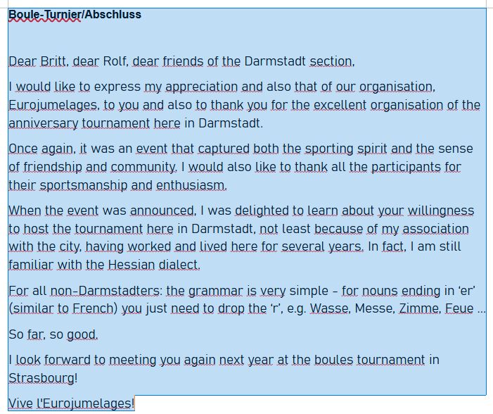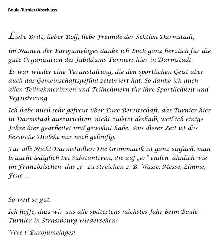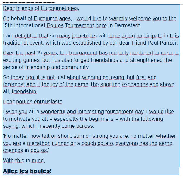 In his welcome speech Peter Backes, president of Eurojumelages, stressed the sense of community of the association and also remembered Paul Pantzer, the founder of the Eurojumelages boule tournament. He ended his talk with the slogan: “No matter how large or small, slender or strong you are, irrelevant whether you are a marathon runner or a couch potato, when playing boules all have equal chances.”