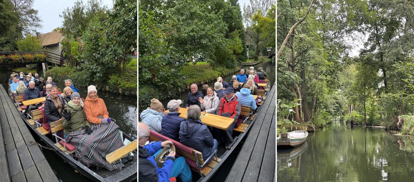 Hier erwartete uns schon die „Burger Rumpel-Guste“ (Kleinbahn) die uns nach einer halbstündigen Rundfahrt am Bootshaus Rehnus, zu einer Kahntour, absetzte. Eingehüllt in Jacken und Decken, den Regenschirm griffbereit, fuhren wir 2 Stunden durch die Kanäle, informiert mit vielen Details durch den Kahnführer.