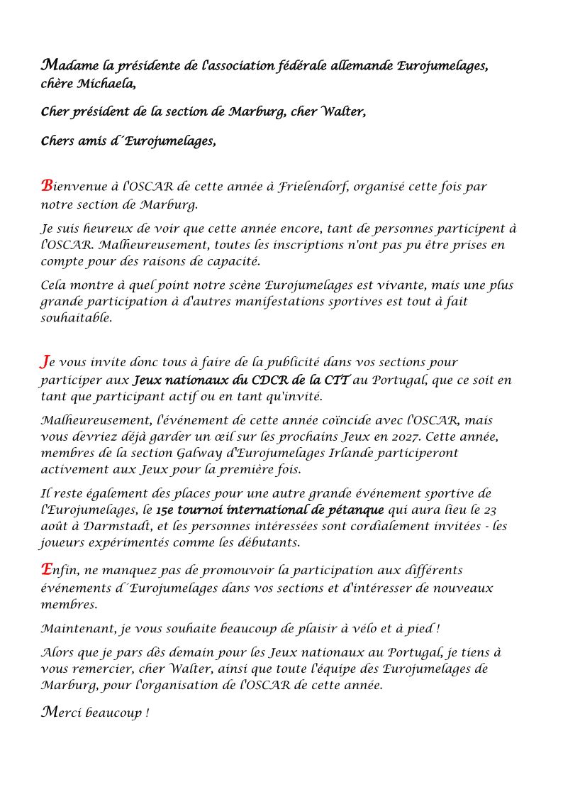 Le président d'Eurojumelages, Peter Backes, n'a pas non plus manqué de saluer les participants d'OSCAR. Après le buffet du soir, Walter et Diethard de la section de Marburg ont souhaité officiellement la bienvenue à tous les jumeleurs et ont fait plusieurs annonces sur le déroulement de la semaine. Peter Backes a fait un bref discours, dans lequel il a regretté de ne pas pouvoir participer à OSCAR cette année en raison d'un chevauchement avec les jeux nationaux du CDCR dos CTT au Portugal, auxquels il était invité et il a donc du nous quitter dès le lendemain.